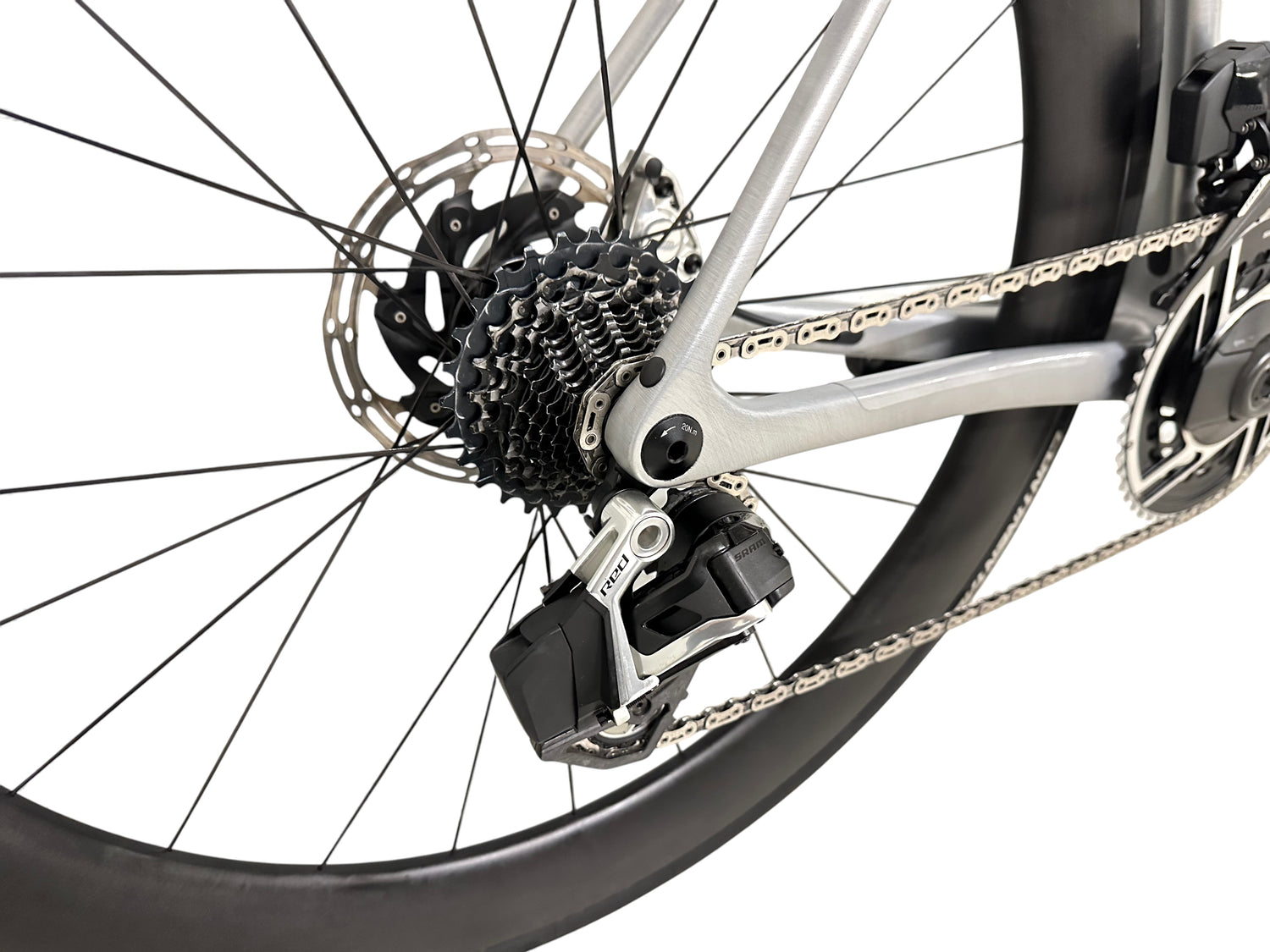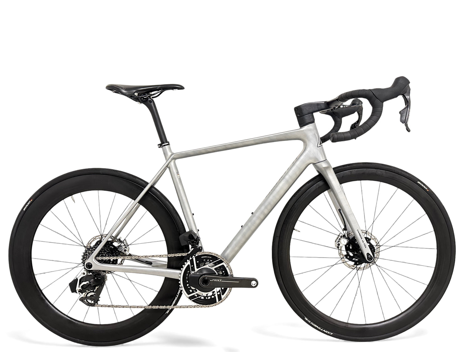 Der nur 730 g leichte Rahmen besteht aus 14 verschiedenen Carbonfasern und bietet extreme Steifigkeit bei gleichzeitig beeindruckendem Komfort. Die spezielle Silber-Lackierung ist auf 100 Stück limitiert und wiegt lediglich 35 g. Das Fahrgefühl ist sportlich, direkt und dennoch angenehm gedämpft – ideal für Rennfahrer, die höchste Performance suchen.