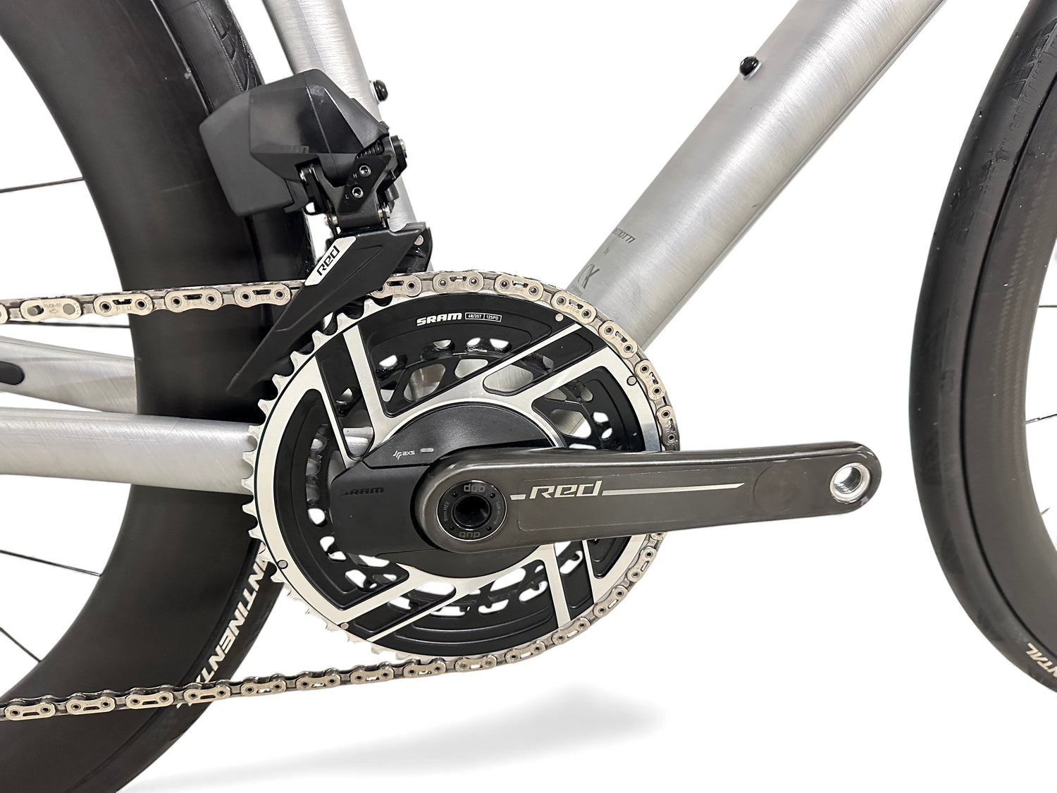 Die elektronische SRAM RED AXS 2x12 Schaltgruppe liefert präzises, kabelloses Schalten auf Profi-Niveau. Dank Powermeter mit beidseitiger Messung hast du deine Leistung jederzeit im Blick. Die SRAM Paceline X Bremsen mit 160/140 mm Scheiben bieten fein dosierbare und kraftvolle Bremsleistung.
