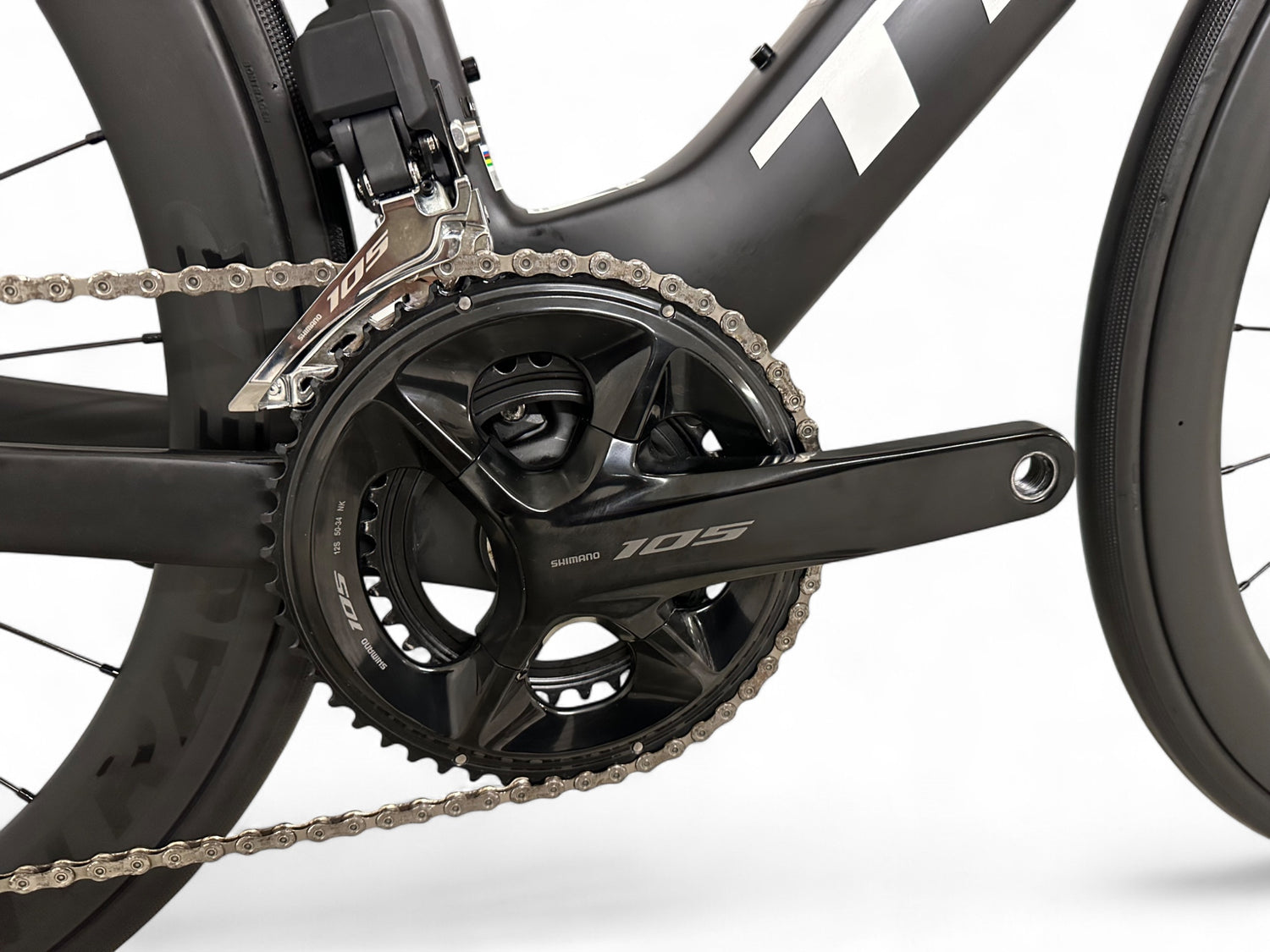 Mit dem elektronischen Shimano 105 Di2 12-fach Antrieb schaltest du präzise, schnell und wartungsarm. Die 50/34-Kurbel und die 11-34 Kassette bieten eine ideale Übersetzungsbandbreite für Anstiege und Sprints. Alle Komponenten sind perfekt auf Performance und Effizienz abgestimmt.